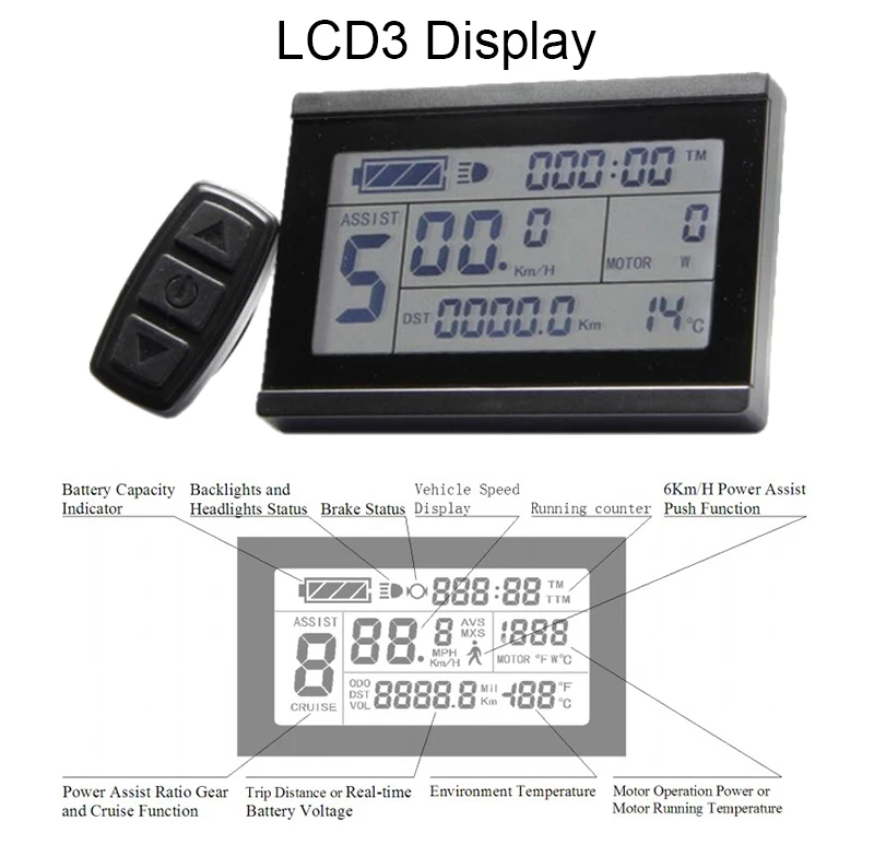 Speed display, power-assisted gear display, power indicator, fault prompt, total mileage, single mileage, headlights and single driving time display.